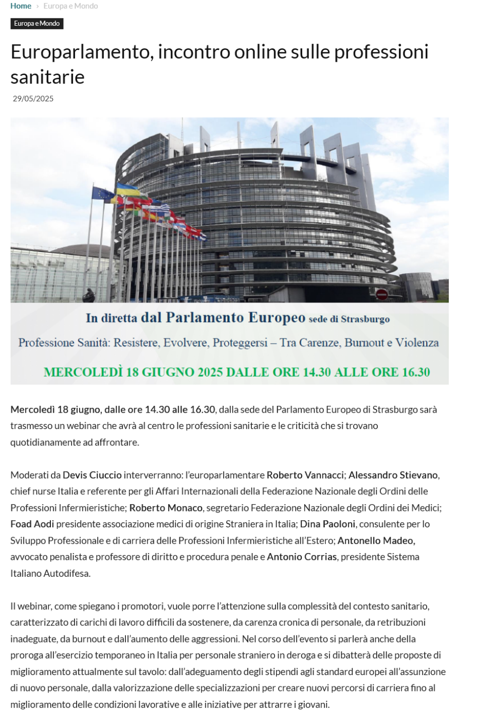 In occasione della conferenza "Professione Sanità" tenuta al Parlamento Europeo a Strasburgo, il Prof. Foad Aodi ha lanciato un allarme sulla crisi sanitaria italiana ed europea. L'evento, promosso dall'Europarlamentare Roberto Vannacci, ha visto anche la partecipazione di Antonio Corrias, Presidente del Sistema Italiano Autodisidensa (SIA), in un dibattito di alto profilo che ha analizzato le criticità del settore. Aodi ha evidenziato come in Italia manchino all'appello 125mila medici e 60mila infermieri, una carenza strutturale che rischia il collasso del sistema. Un paradosso accentuato dalla mancata piena integrazione dei professionisti stranieri: su 110mila operanti in Italia, il 65% è ancora escluso dal SSN, nonostante il loro contributo abbia salvato oltre 2.900 reparti nel biennio 2023-2024. La conferenza, ospitata dal Parlamento Europeo, ha così fatto da cassa di risonanza a emergenze come il burnout, le aggressioni al personale (25.940 episodi nel 2024) e la fuga dei cervelli. Sono state quindi presentate proposte concrete per una sanità più giusta, inclusiva e sostenibile, chiedendo alle istituzioni, incluso il Parlamento Europeo, un cambio di passo immediato.